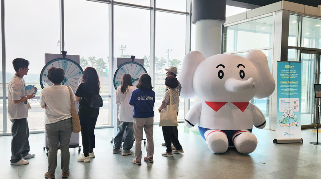 Visitors came to SK Innovation’s booth could take photos with SK Innovation’s eco-friendly character Happy Elephant and Busan Metropolitan City’s mascot Boogi (Busan Seagull), and participate in the Wheel of Action roulette game to win special gifts. These include Usisan’s T-shirts made from upcycled waste plastics and Grapelab’s laptop stands made from recycled paper. Both Usisan and Grapelab are eco-friendly social enterprises supported by SK Innovation.