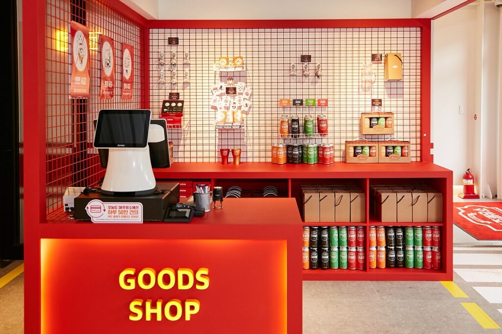 ▲ Various aspects of the SK Liquor Station pop-up store incorporates components that promote the company and brand, including a beer dispenser inspired by fuel pumps and merchandise featuring SK Innovation’s mascot, the Happy Elephant.