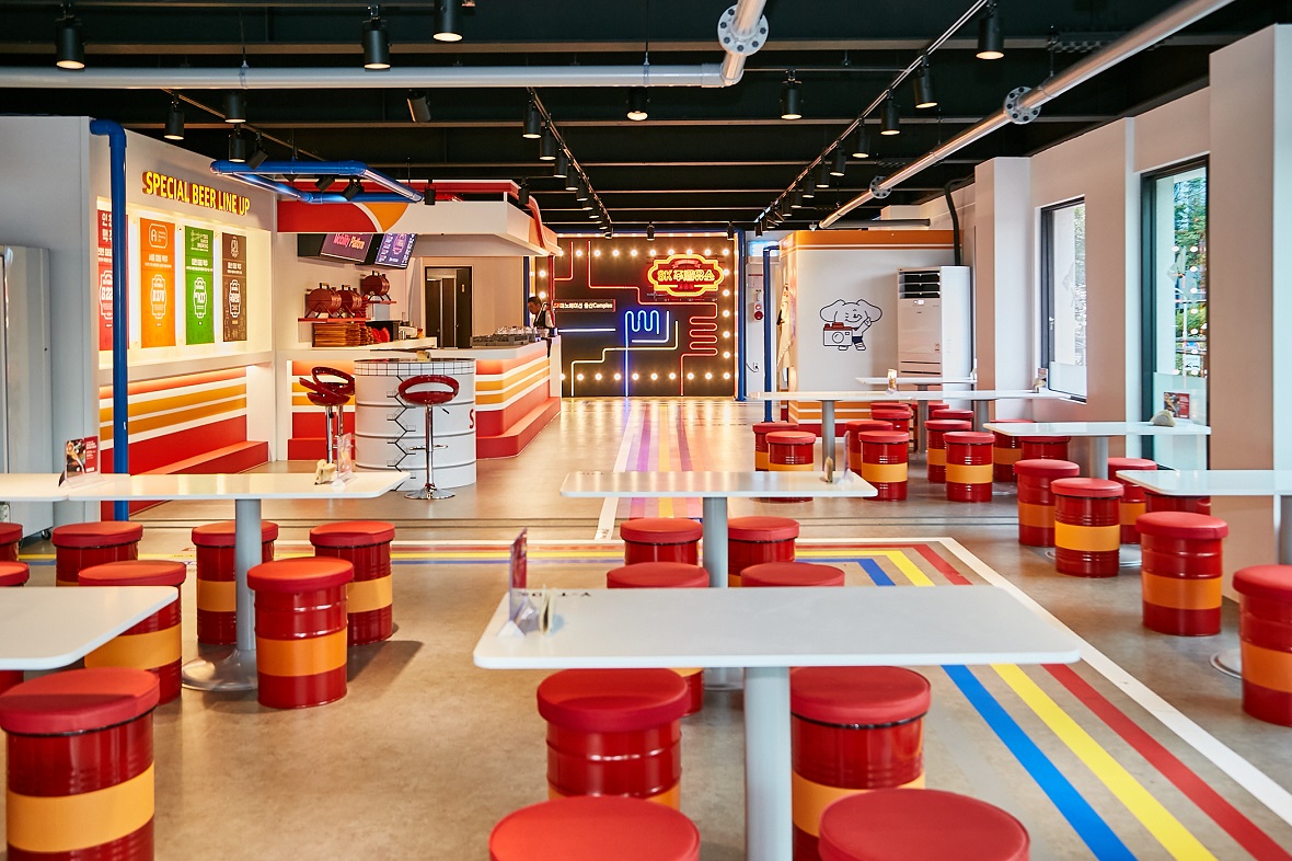 The drum-shaped tables, where one can enjoy food and drinks, also bring to mind the image of a gas station. While many people visit gas stations to refuel their vehicles, the meaning behind it may vary slightly for each person. It could be a family stopping by on an exciting vacation journey, someone diligently filling up before a long-distance business trip, or a novice driver with a nervous heart refueling for their first long drive. Each individual has their own unique memories associated with gas stations. The delightful interior ambiance is a great place for one to recall those memories while enjoying a refreshing beer.