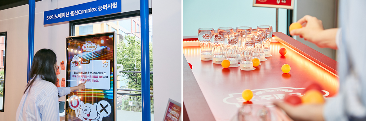 The game zone was also bustling with visitors. Games such as the SK Liquor Station Beer Pong, where players toss ping pong balls into cups with the gas station logo, and the essential pub game of darts, added to the summer night’s fervor. One visitor, who came to the pop-up store with colleagues after work, enthusiastically declared, “If this beer house is this much fun, I wouldn’t mind spending every Friday night here!” Moreover, during the SK Ulsan Complex Ability Test event, visitors had the opportunity to learn fascinating stories related to the SK Ulsan Complex. The idea of making corporate stories interesting and engaging for everyone made the pop-up store even more enriching.