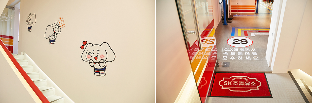 ▲ The staircase leading up to the second floor is decorated with the Happy Elephants and guiding signs that illustrate the pipeline of the Ulsan CLX.