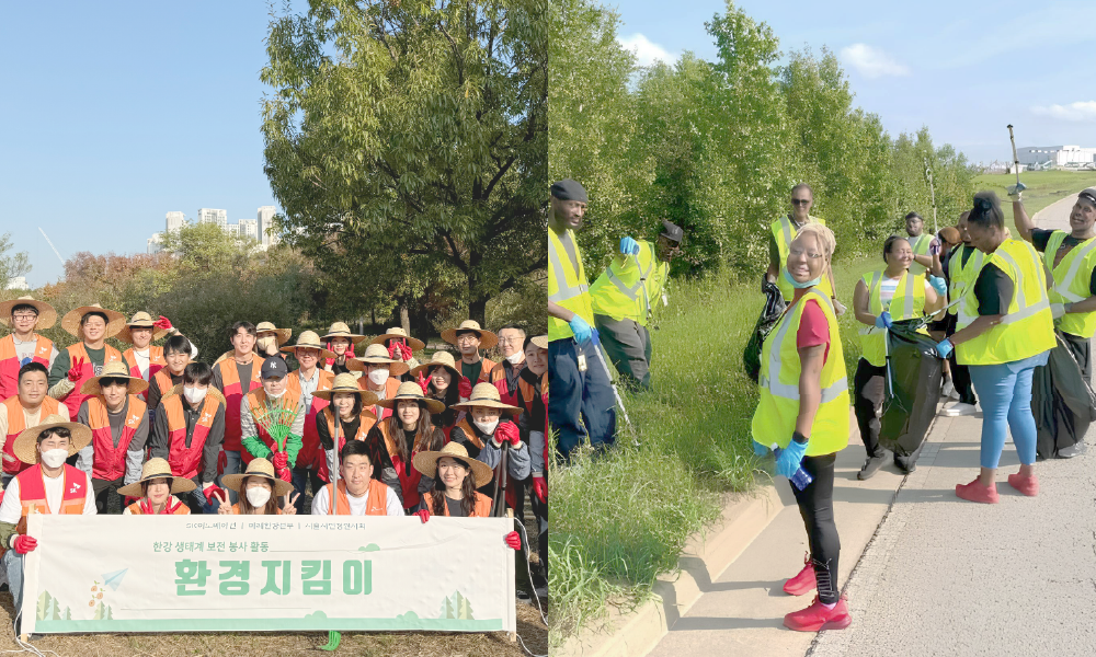 ▲ SK On employees removing invasive plant species along the Hangang River in Seoul (left) and U.S.-based SK On employees cleaning local roadways through a community program (right)