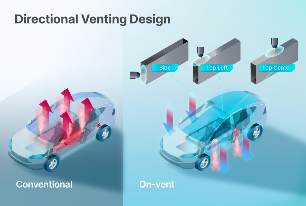 In the event of thermal runaway, high-temperature gases can be rapidly discharged outward before spreading to adjacent cells, reducing secondary risks. In addition, the position of the vent hole can be aligned with the cell assembly direction, while at the pack level, vent paths can be designed to guide gas toward the underside or side of the vehicle. This allows heat and gas to be directed away from occupants and toward the exterior of the vehicle.