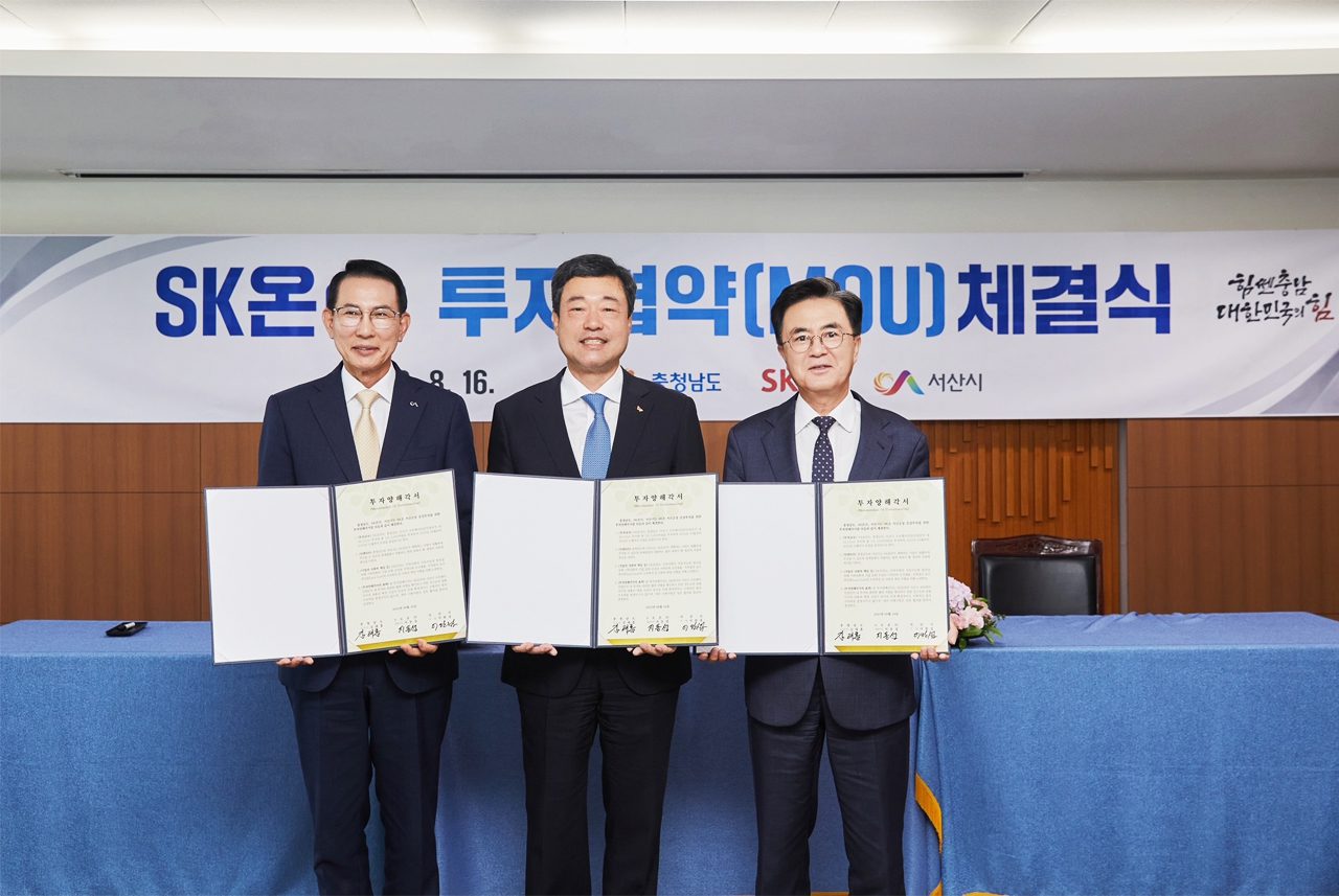 [Photo] Governor of South Chungcheong Province Kim Tae-Heum (right), Seosan City Mayor Lee Wan-seop (left), SK On CEO Jee Dong-seob (center) signed the SK On Investment Agreement (MOU) with Seosan City at the Provincial Office in Hongseong-gun, South Chungcheong Province, South Korea, on August 16 (local time).