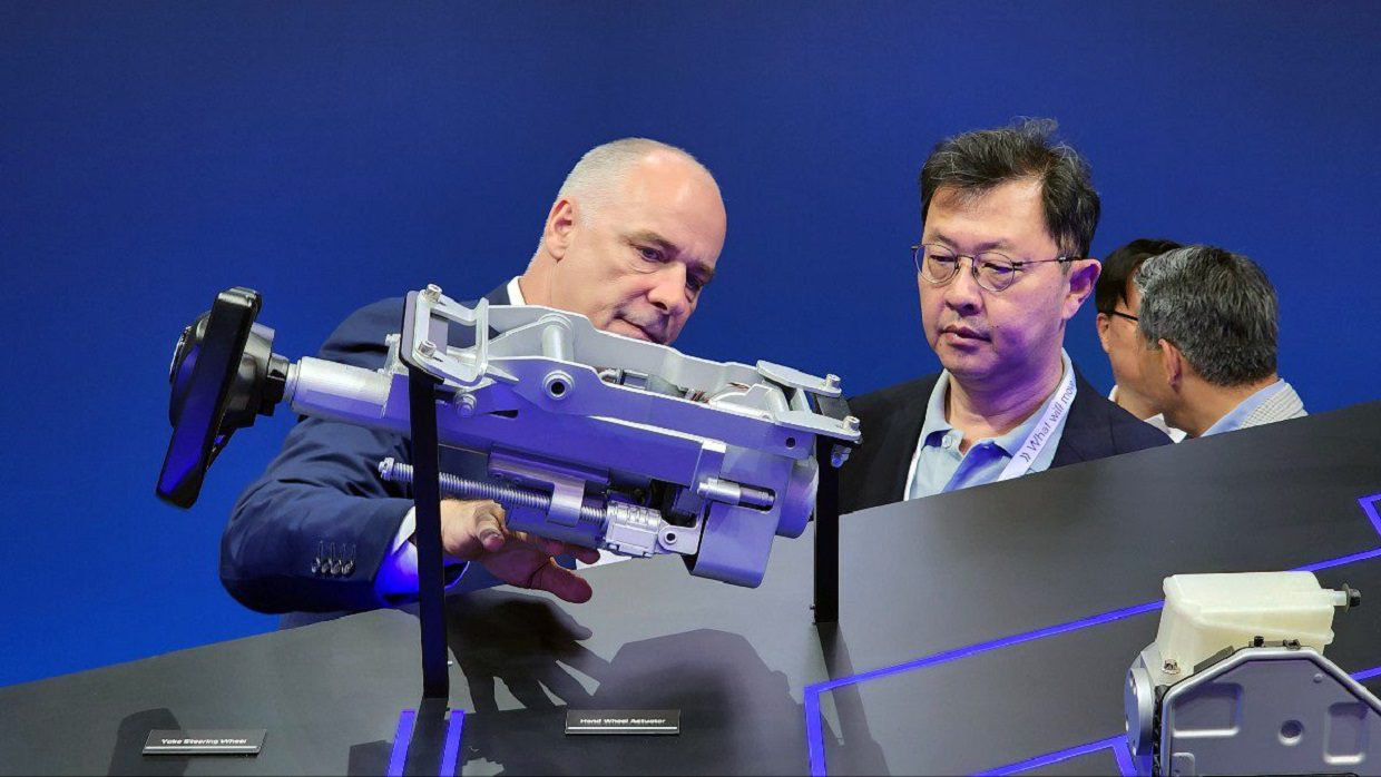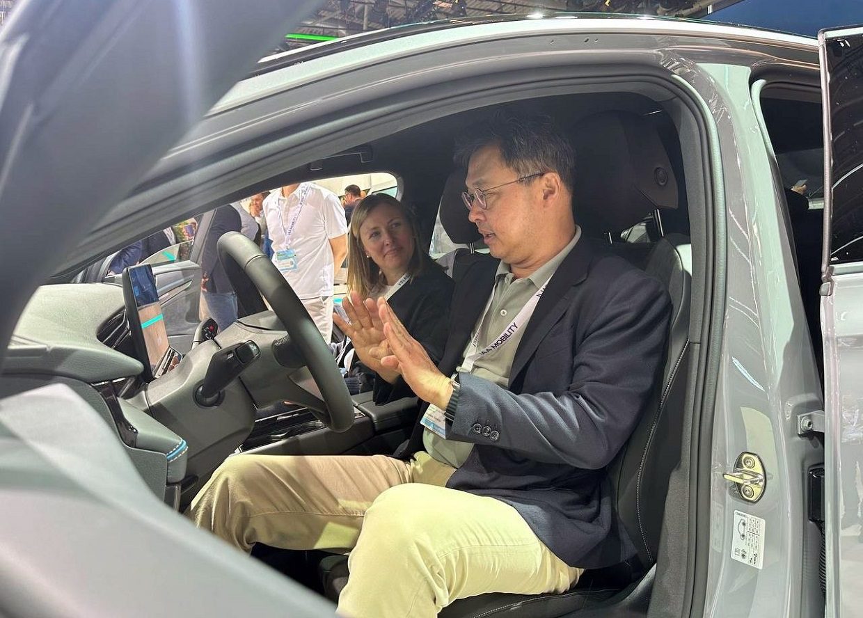 (Photo 4) Chey Jae-won, Executive Vice Chairman of SK On, listening to an explanation of the EV9 from Hyundai Mobis officials on the first day of Europe’s largest mobility show, IAA 2023, on September 4 (local time).