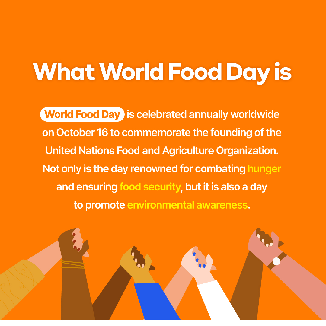World Food Day is observed worldwide on October 16 to celebrate the founding of the United Nations Food and Agriculture Organization. It is also a day to increase awareness of world hunger, food security, and the environment.