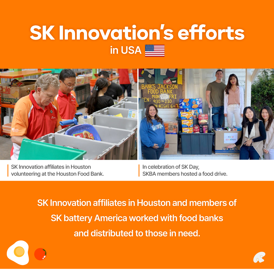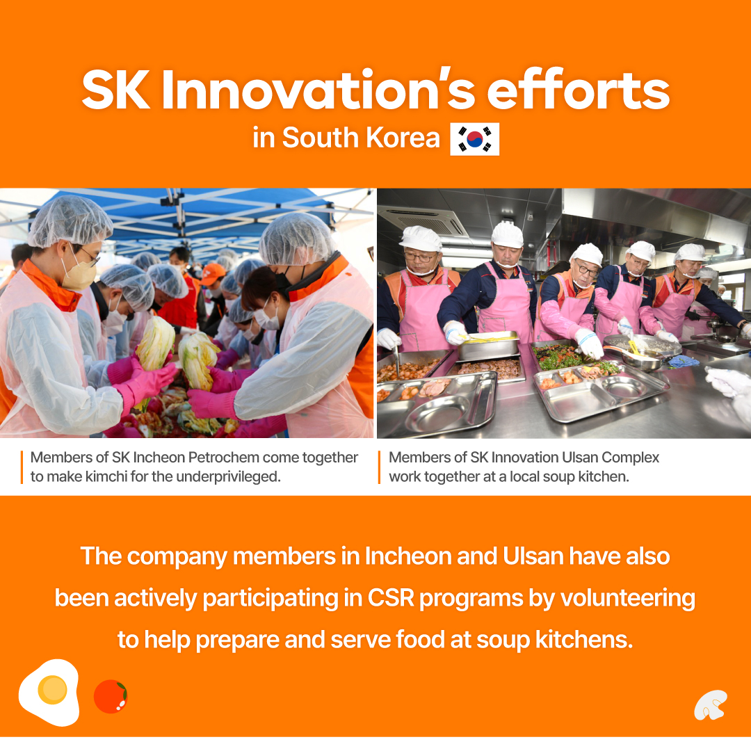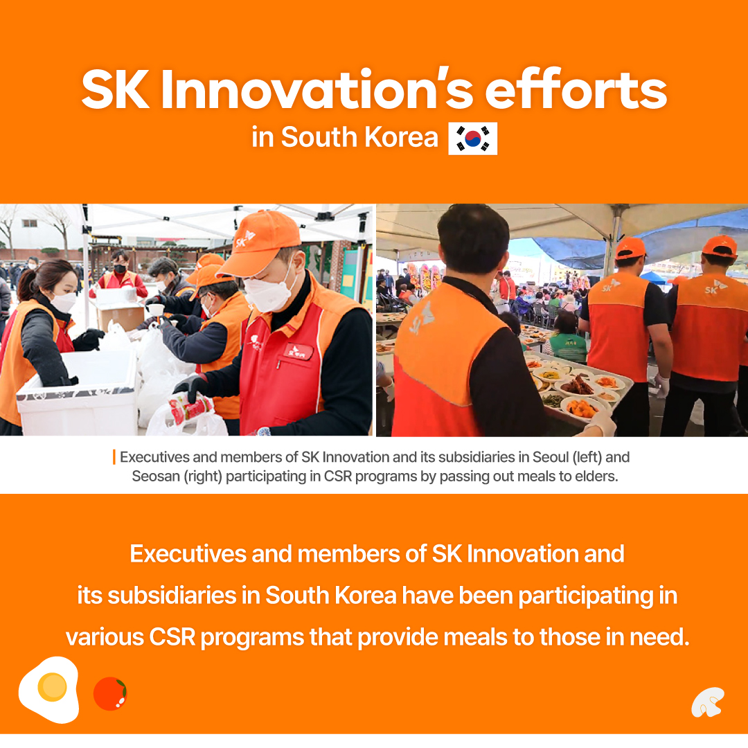 SK Innovation and its subsidiaries are making efforts to help those in need by hosting food drives, volunteering at soup kitchens, distributing meals, etc.