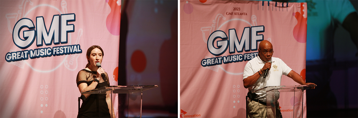 ▲ Keybo Taylor, Gwinnet Count Sheriff (left) and Keida Ackerman, Director of State and Local Government Affairs, Global Development Group, SK Group (right) deliver messages at GMF in USA 2023.