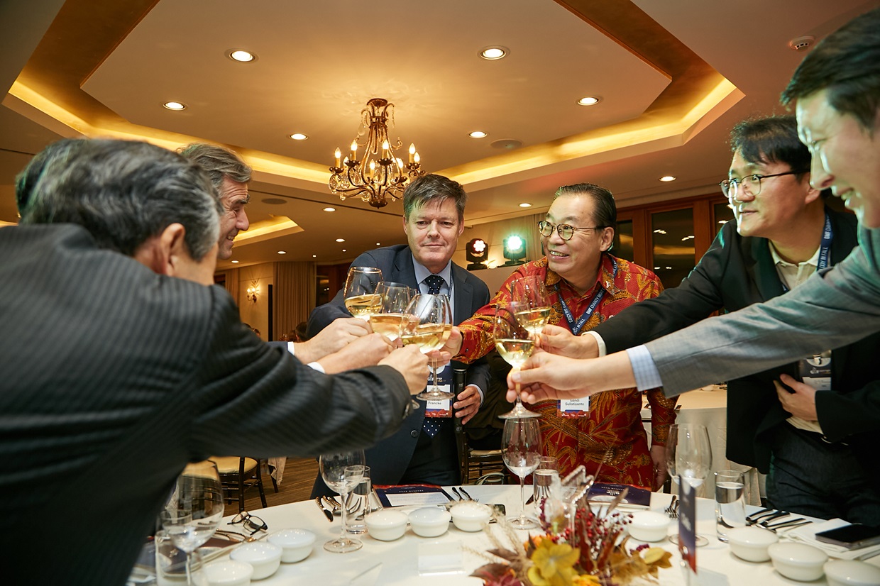 ▲ Attendees shared a toast as they exchanged greetings before the event began.