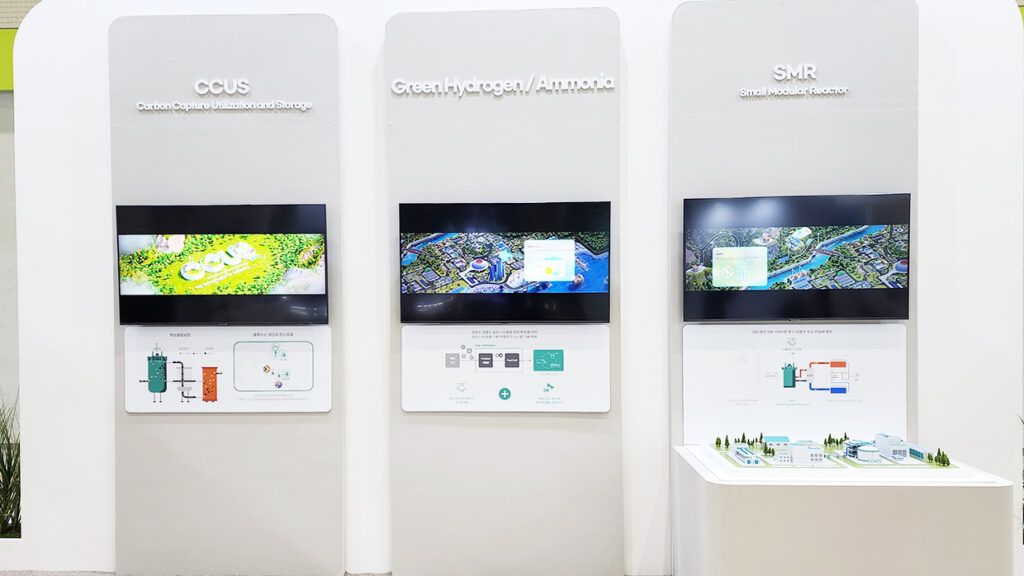 In the Clean Mobility zone, attendees can see SK Inc.’s EV charger technology, consisted of an unrivaled charger manufacturing know-how and global infrastructure. In addition, displays of SK E&S’s hydrogen fuel cell business model, which is currently applied across various industrial fields, are showcased. Drones that are equipped with hydrogen fuel cells provide a glimpse into the future eco-friendly mobility industry that is envisioned by SK Group. Meanwhile in the Clean Energy Zone, SK’s Small Modular Reactor (SMR) plant model and ammonia decomposition-based fuel display system technology, as well as the Carbon Capture and Utilization Storage (CCUS) technology that captures, stores, and utilizes carbon dioxide, demonstrate SK’s advanced technology committed to green growth.