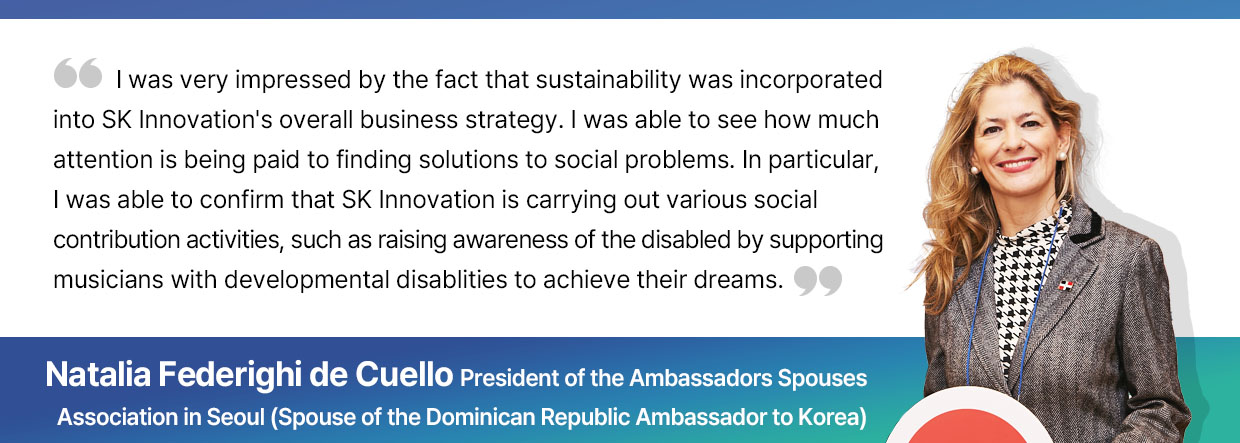 The event was held to share information about social contribution activities that SK Innovation and ASAS are each pursuing. It was attended by spouses of ambassadors from various countries, including the Dominican Republic, United Kingdom, Finland, Switzerland, Netherlands, Tanzania, Bolivia, Peru, Columbia, and etc. Lim Su-kil, Head of SK Innovation Value Creation Center, gave a welcome speech and expressed his deep gratitude for their visit. Natalia Federighi, President of the ASAS, gave her gratitude greeting, saying “We truly appreciate your willingness to share insights with us, representing a Korean leader company. SK Innovation’s commitment to creating value for society, and the collaborative efforts with various countries and governments, serve as an inspiring example.”