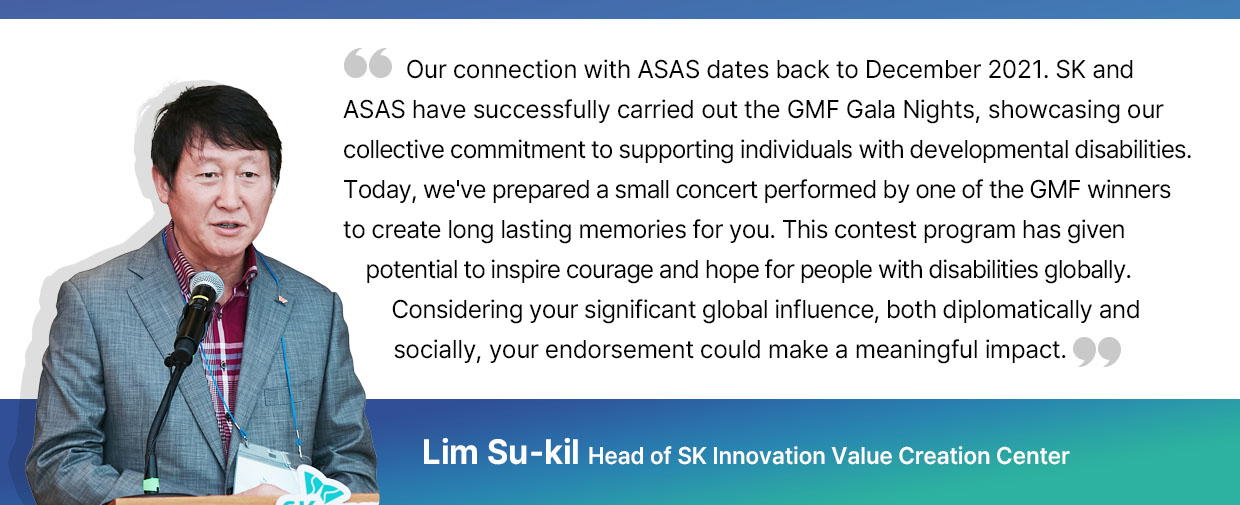Right after GMF in the US, SK Innovation also hosted the GMF Charity Night Gala 2023, which was participated by diplomatic envoys to Korea from 24 countries. The Gala was an opportunity for the ambassadors and their spouses to enjoy the performances of previous GMF award-winning teams, and it was also where the ASAS got in touch with SK Innovation.