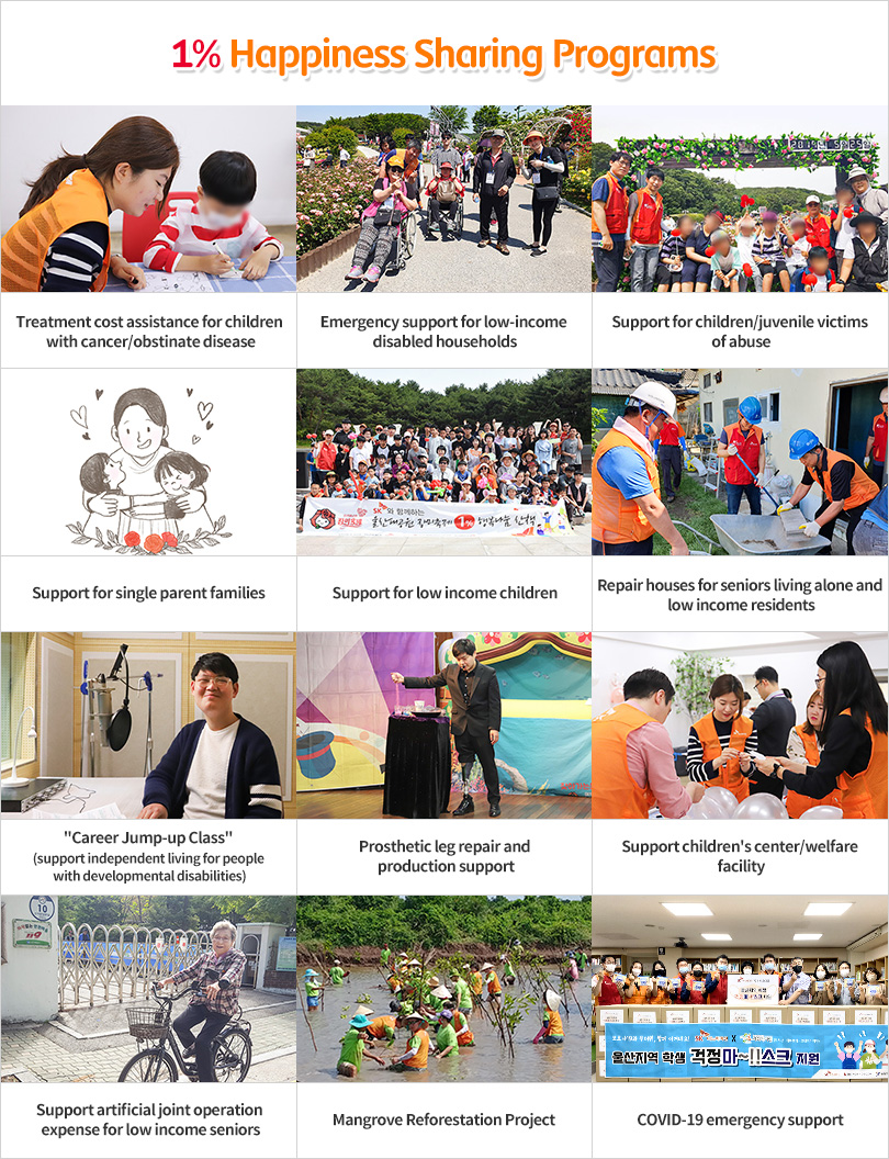 SK Innovation has been operating various CSR programs including supporting the vulnerable people, job creation through promoting social enterprises, and projects for the independence of workers with developmental disabilities. All activities are managed with the support of NGOs or a group of experts across Seoul, Incheon, and Ulsan, the three major business sites of SK Innovation in Korea.