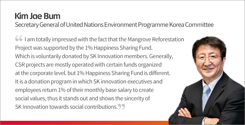 As one of CSR programs, SK Innovation has launched the Mangrove Reforestation Project in Vietnam, partnering with Korea Association for UNEP2 since 2018. As of 2019, more than 160,000 of mangrove trees were planted on a total of 40 ha area in Vietnam and the volunteers also conduct environmental education and participate in other charity works for the local children.