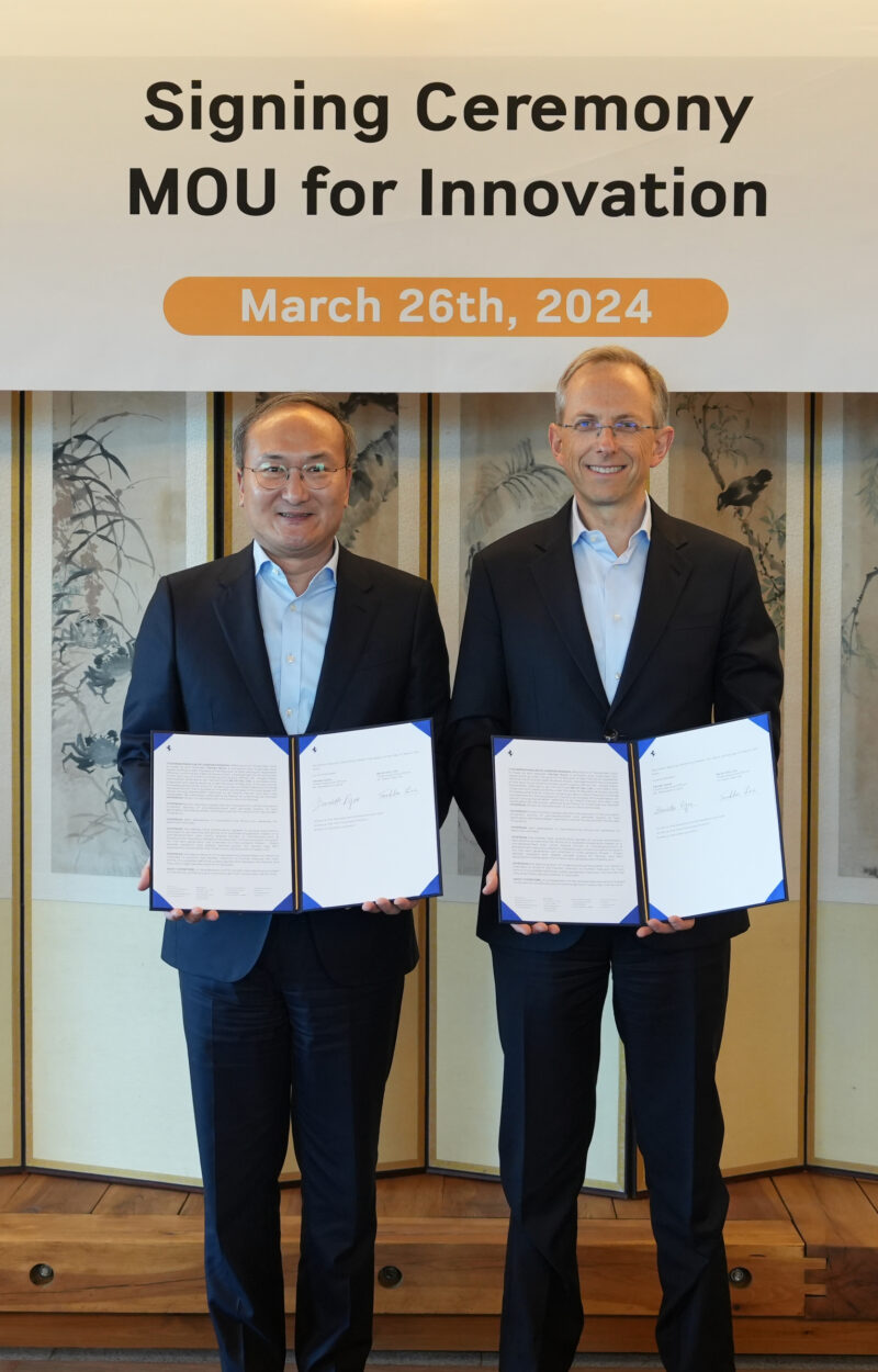 (Photo 1,2) SK On Chief Executive Officer Lee Seok-hee (left) and Ferrari Chief Executive Officer Benedetto Vigna (right) take a commemorative photo after signing a MOU to lead innovation in battery cell technology at SK Seorin Building in Seoul on March 26.