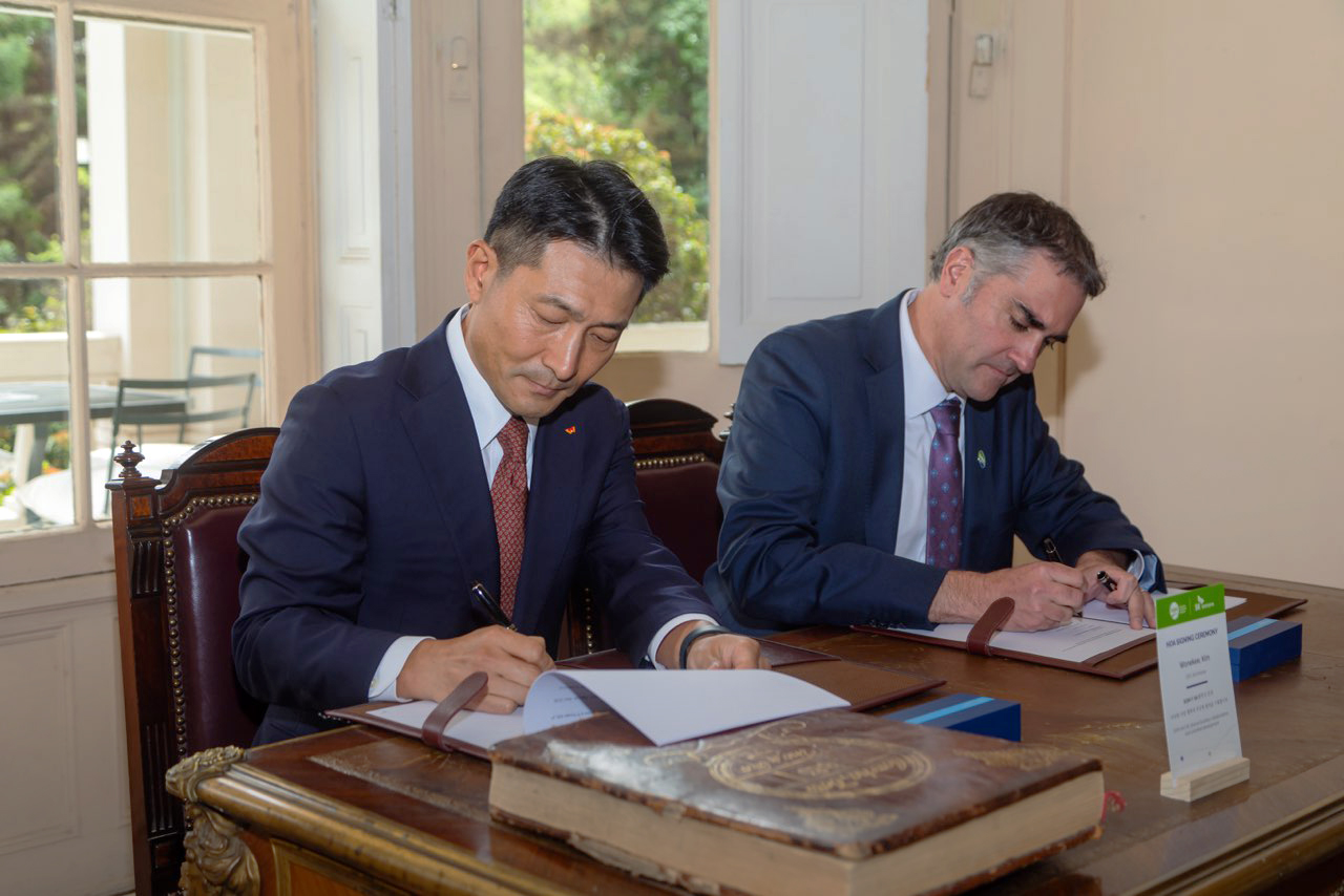 [Photo] Kim Wone-kee, CEO of SK Enmove (left) and Pablo Altimiras, CEO of SQM-Iodine Plant Nutrition Division (right) sign a Heads of Agreement (HOA) for the supply of iodine on October 1st in Santiago, Chile (local time).