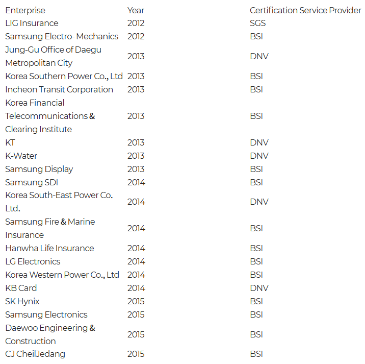 *Korea East-West Power Co., Ltd., Korea Western Power Co., Ltd., and Korea South-East Power Co., Ltd. obtained the certification in 2015, while Korea Southern Power Co., Ltd. earned it in 2013.