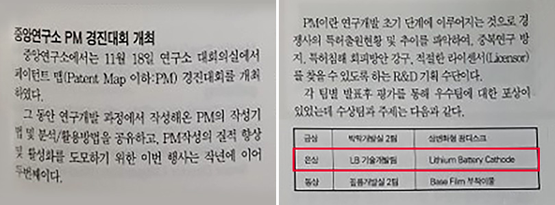 The Company Newsletter released in January 1997 shows that the “LB (Lithium Battery) Technology Development Team,” which conducted research and development under the theme of “Lithium Battery Cathode,” won the silver prize at the Patent Map (PM) contest held in the conference room of the Central Institute on November 18, 1996.