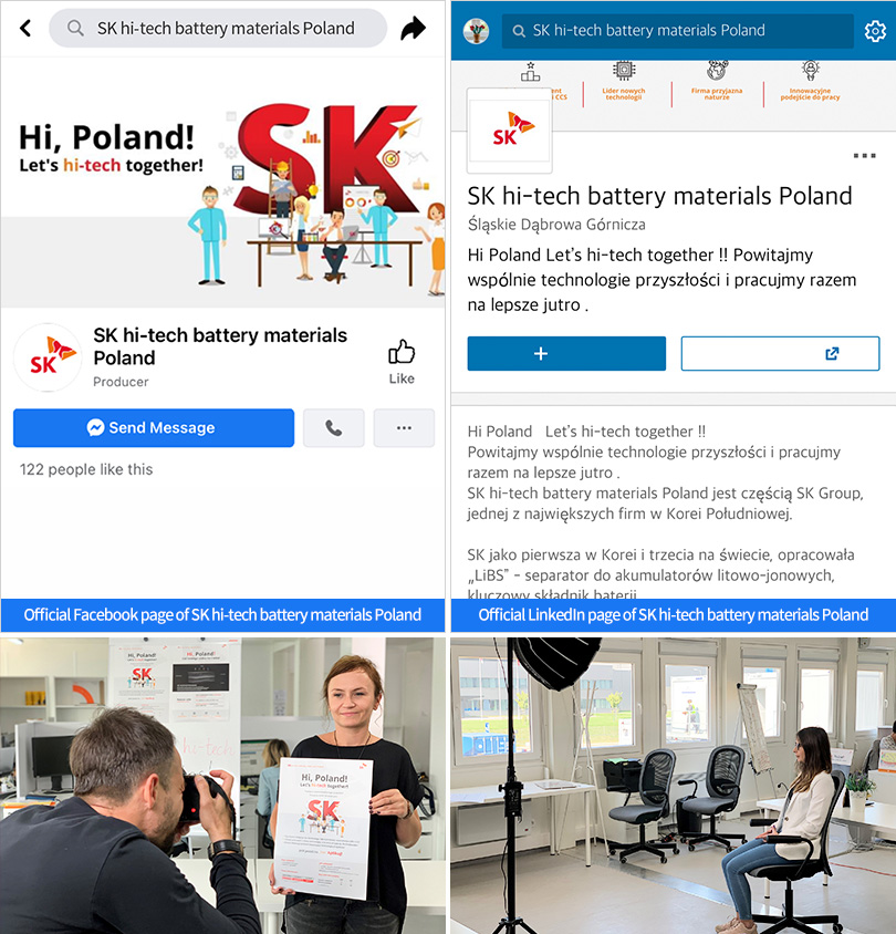 ▲ (Top) Official Facebook and LinkedIn page of SK hi-tech battery materials Poland/ ▲ (Bottom) SK hi-tech battery materials Poland members prepare for the local recruiting content