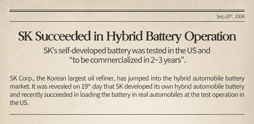 According to an article published on September 20, 2006 SK developed its own hybrid automobile battery (medium & large lithium ion battery) and recently succeeded in loading the battery in real automobiles at the test operation in the US.