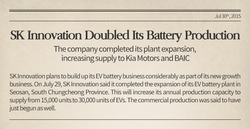 On July 30, 2015, an article reported, “SK Innovation said it completed the expansion of its EV battery plant in Seosan, South Chungcheong Province. This will increase its annual production capacity to supply from 15,000 units to 30,000 units of EVs. The commercial production was said to have just begun as well.”