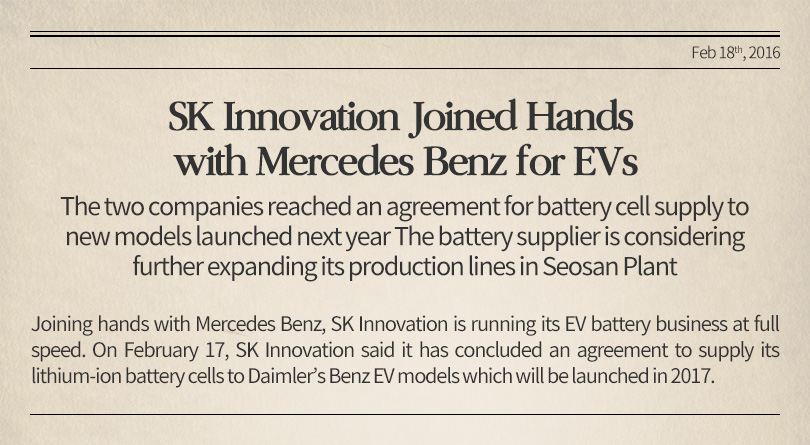 A report on February 18, 2016, reads SK Innovation concluded an agreement to supply its lithium-ion battery cells to Daimler’s Benz EV models which would be launched.