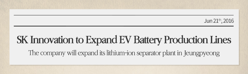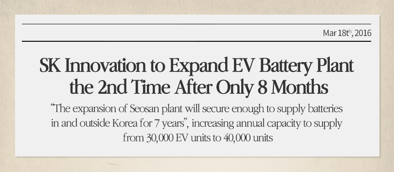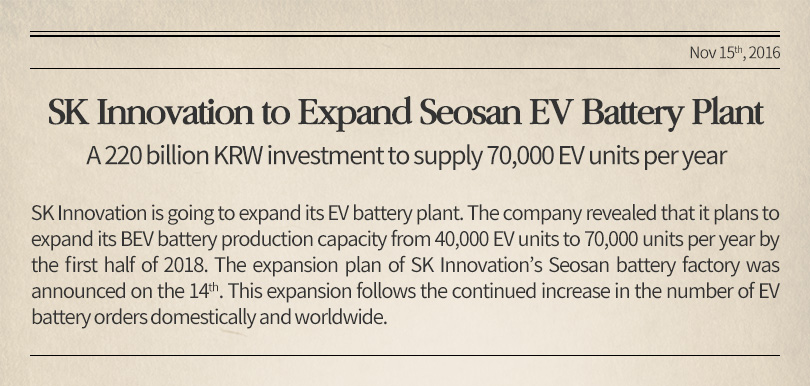 An article released on November 15th, 2016, reported n SK Innovation’s plan to expand the battery factory in Seosan, Chungcheongnam-do, Korea. According to the article, SK Innovation’s expansion plan announced on November 14th is due to the continued increase in EV battery orders at home and abroad.