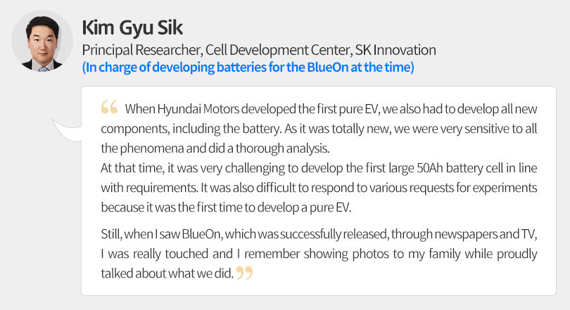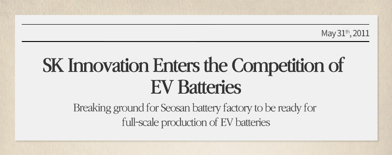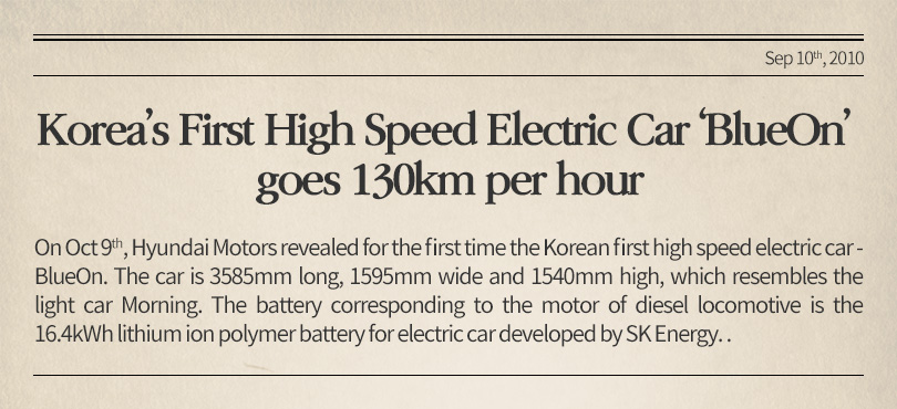 In an article released on September 10, 2010, it was reported that SK’s lithium ion polymer battery for electric car was installed on ‘BlueOn’, Korea’s first high speed electric car.
