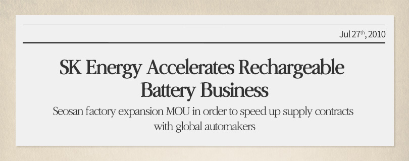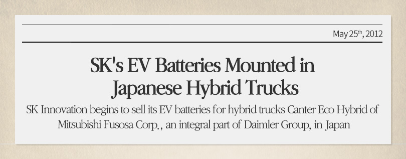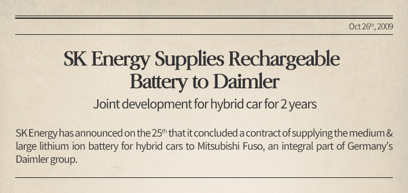 According an artice on October 26, 2009, SK has concluded a contract of supplying the medium & large lithium ion battery for hybrid cars on October 25th to Mitsubishi Fuso, an integral part of Germany’s Daimler group.