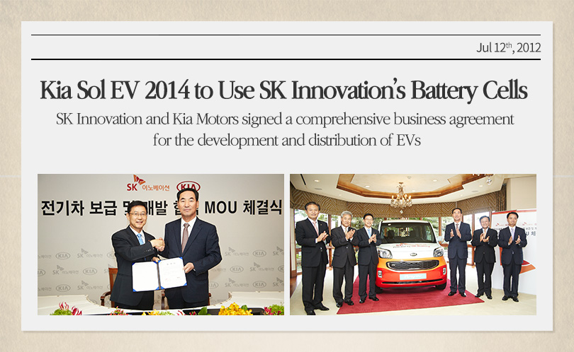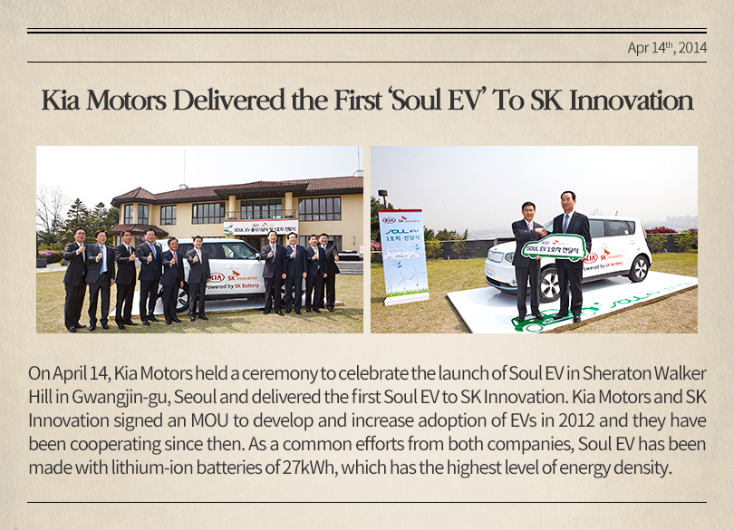 According to a report on April 10, 2014, Kia Motors launched ‘Soul EV’ with SK Innovation EV batteries mounted on it. Another report on April 14 said the automaker delivered the first Soul EV to SK Innovation.