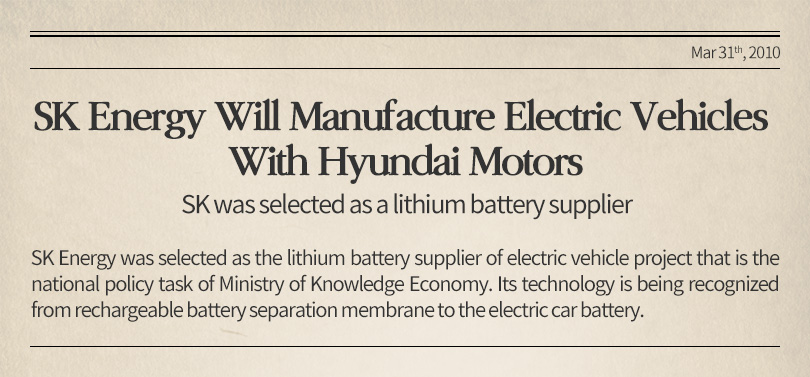 The article released on March 31, 2010 quoted an SK official “SK has joined with Hyundai Motors in the national policy task of Korean Ministry of Knowledge Economy” and “SK’s battery will be put in 100% pure electric cars(2) that will be commercialized first in the country.”