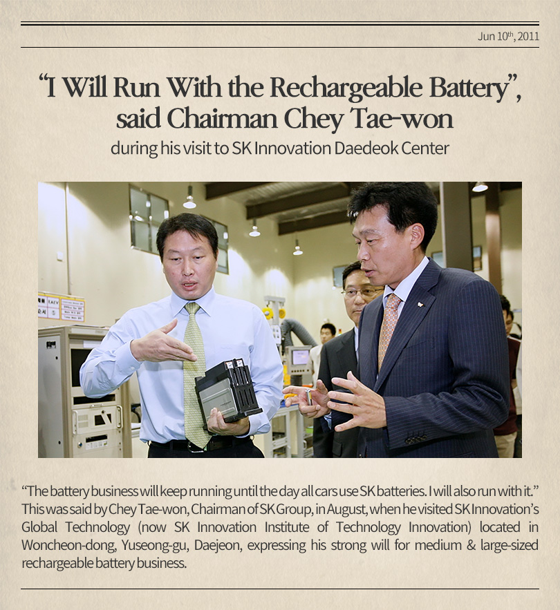 In June 2011, Chey Tae-won, chairman of SK Group, visited SK Innovation Institute of Technology Innovation (formerly Global Technology) and showed his strong commitment to the EV battery business.