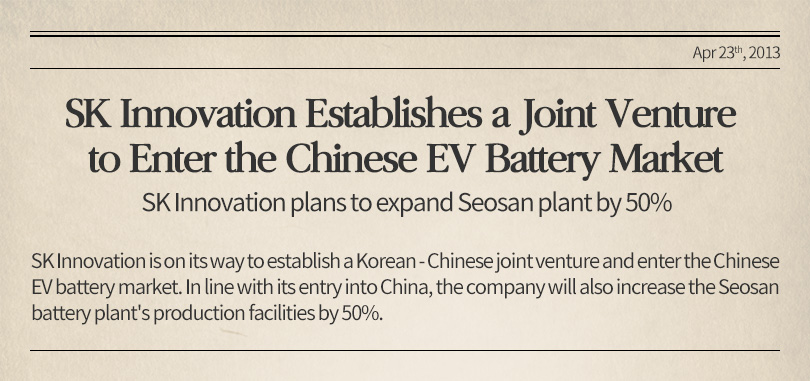 A newspaper report released on April 23, 2013 revealed “SK Innovation signed a LOI (letter of intent) to establish a joint venture for EV batteries in Beijing on the 22nd.”