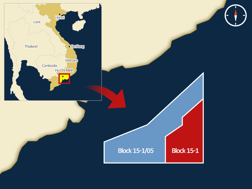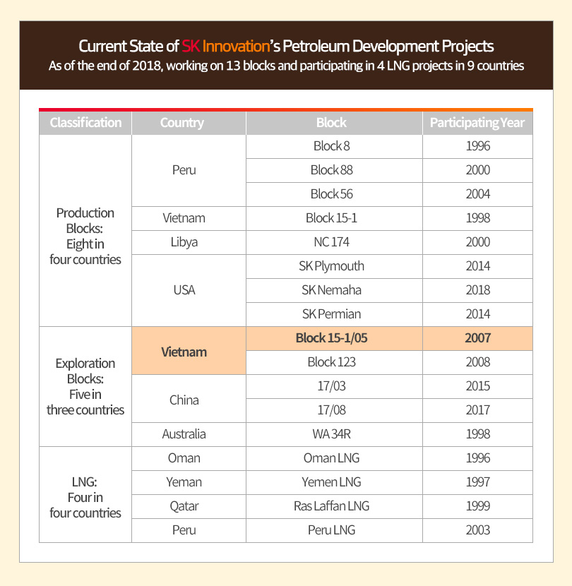 Block 15-1/05 in Vietnam is located in the Cuu Long* Basin alongside block 15-1, where SK Innovation started producing crude oil in 2003. The company thus signed a contract for mining right for block 15-1/05 with the Vietnamese government in February 2007. As for block number 15-1/05 of Vietnam, SK Innovation holds 25% of total shares; a United States company (Murphy), 40%; and PetroVietnam Exploration Production Corporation (PVEP), a state-run petroleum company of Vietnam, 35%.
