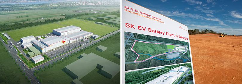 ▲ Aerial view (left) of the factory in Komárom (Factory 1), Hungary, that SK Innovation is currently constructing and the lot for the factory in Georgia, United States (right)