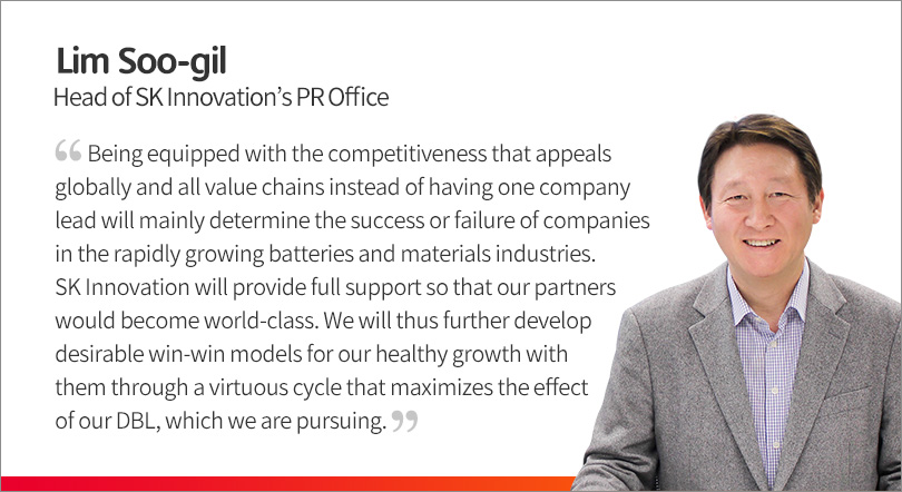 The win-win cooperation model that SK Innovation is pursuing with its partners is drawing great attention, because it involves advancing into the global market mainly with Korean SME partners. Until now, large construction companies have worked on the construction of batteries and materials facilities from their design to their construction because of the short construction period, and only a few companies possess the experience designing such factories given the nature of the industry. As such, it was an environment wherein SMEs could not possibly even have the opportunity to participate in such projects.