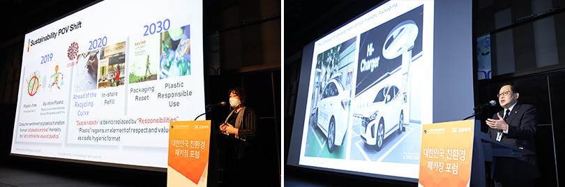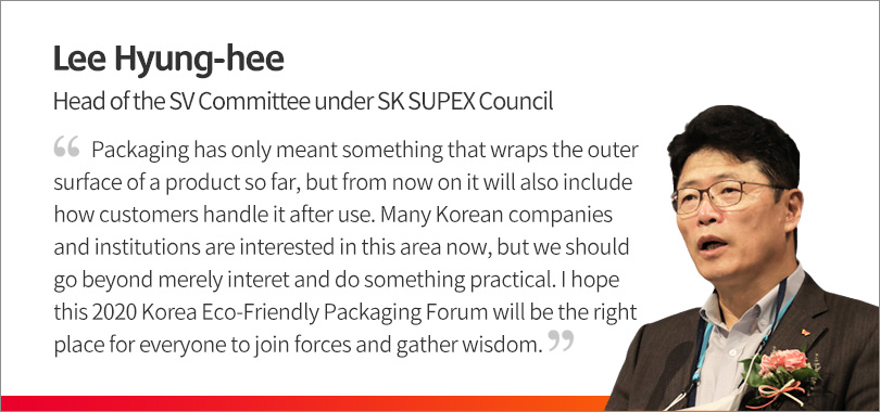 The 2020 Korea Eco-friendly Packaging Forum started with an opening remark by Dr. Yoo Young-sook from KIST (Korea Institute of Science and Technology), former Minister of Environment, then followed by a congratulatory comment by Lee Hyung-hee, Head of the SV Committee under SK SUPEX Council, who is in charge of ESG of SK Group.