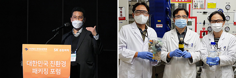 ▲ (Left) Cho Sang-hyun, Senior Manager of R&D Innovation Office, SK Innovation Research Institute for Technology Innovation at the third session on the theme of Recycling: Material Supplier & Convertor. / (Right) Researchers from SK Innovation Institute of Technology hold the prototypes of waste plastics, pyrolysis oil, and solvents used as recycled raw materials.