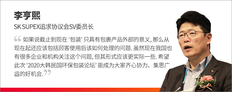 “2020大韩民国环保包装论坛”于11月18日拉开了帷幕,前环境部长官、KIST教授刘荣淑致开幕词,负责SK集团ESG的SUPEX追求协议会SV委员会委员长李亨熙 致贺词.