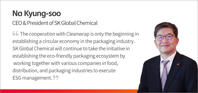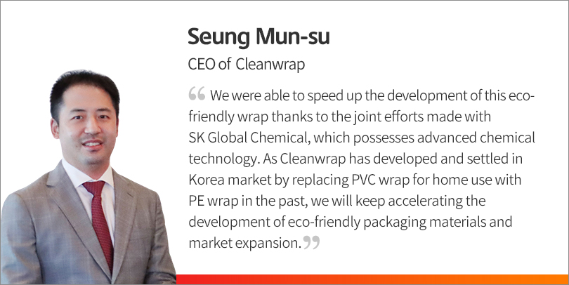 SK Global Chemical, which is taking the lead in establishing a circular economy by solving environmental problems such as waste plastic issues, was the first one to propose this joint development of the “Eco-friendly PE wrap for commercial use” to Cleanwrap, its long-time customer.