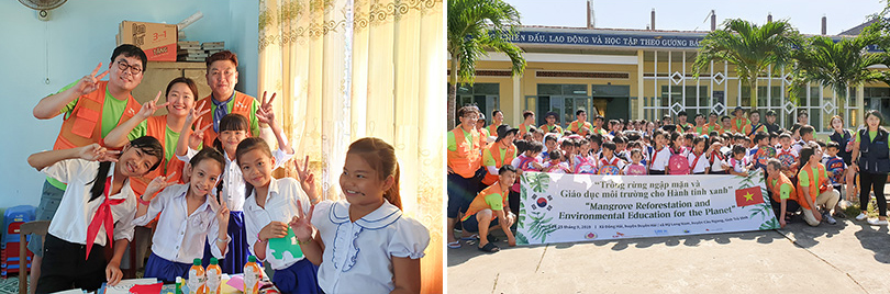 Based on various studies, Vietnam used to cover vast areas of mangroves, and they are among the most productive and biologically important ecosystems of the world. However, in the last few decades, Vietnam was reported with a great loss of mangroves, and one of the major cause is human acts. Poorly managed activities such as logging and shrimp farming are major threats to not only mangrove ecosystem but also the whole global environment. Therefore, it is essential to raise the awareness among the local residents living around the mangrove forest areas. Realized this need, after every planting activity, SK Innovation always visited the nearby elementary schools to help young students learn more about the importance of mangroves and protecting the environment.