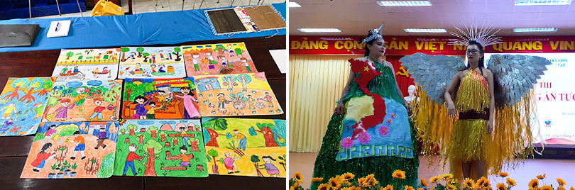 ▲ (Left) The drawing contest for students at Dong Hai A elementary school / (Right) The eco-friendly fashion contest participated by students at Tra Vinh University