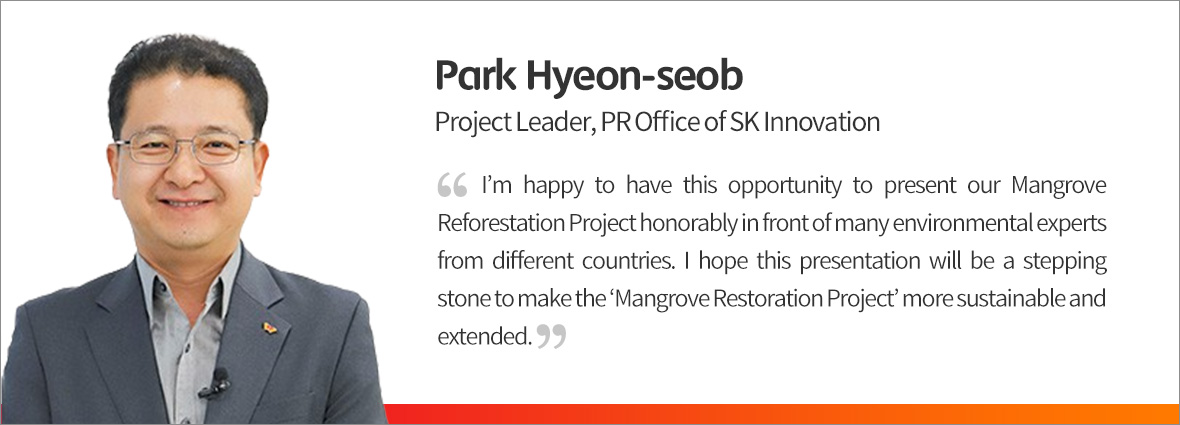 In the presence of government and international organizations involved in environment protection, Project Leader (PL) Park Hyeon-seob of SK Innovation PR Office presented the “Mangrove Reforestation Project,” which was an effort by SK Innovation to recognize the importance of mangrove forests in Vietnam and provide a proactive response toward climate change.