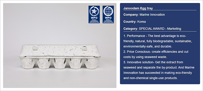 ▲ Marine Innovation’s eco-friendly egg tray won special award at WorldStar Global Packaging Awards 2021 (photo from https://www.worldstar.org/winners_detail/363/)