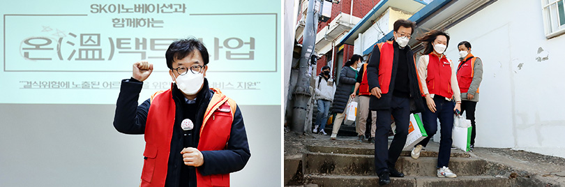 ▲(左上)SK综合化学CEO罗庚秀(左一)和成员们访问独居老人家庭,送去便当和礼物,并问候老人。/(下)SK综合化学成员们走向独居老人家庭。