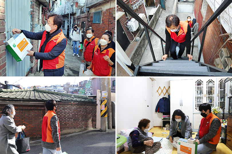 ▲ (左上)SK润滑油CEO车圭卓(左一)和成员们正以非面对面形式向独居老人家庭送去便当和礼物。/(右上) SK润滑油CEO车圭卓为改善独居老人家庭的居住环境,正在楼梯上粘贴防滑胶带。/ (右下)SK润滑油成员们和生活支援师正在访问独居老人家庭送去便当和礼物。