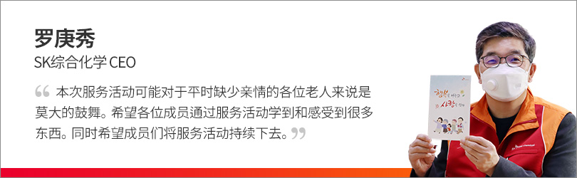 SK综合化学从2016年开始通过成员志愿服务活动项目“分享幸福爱心接力”与首尔西大门区独居老人结缘,并持续开展服务活动。 当天上午,SK综合化学CEO罗庚秀和成员们在正式开始服务活动之前,来到西大门老人综合福利馆,确认注意事项等。为了预防新冠肺炎,难以与独居老人长时间对话,所以他们一字一句地写下饱含真心的亲笔信。