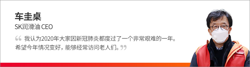 同一天,SK 润滑油CEO车圭卓和成员们在访问独居老人家庭之前,来到市立龙山老人综合福利馆召开说明会。成员们牢记自己小小的关心会给困难的邻居们带去巨大感动和幸福,准备了送给独居老人的以饭、汤、7种小菜组成的便当,在口罩上贴上了真心话贴纸,还为独居老人的健康,特别准备了坚果套装,送去了温暖。