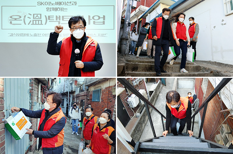 ▲ SK Lubricants CEO Cha Gyu-tak and company members delivered lunch boxes and put anti-slip tape in front of the elderly living alone’s houses