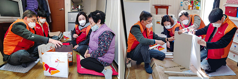Due to the pandemic, it has been over a year since the last time the members of SK Global Chemical visited the seniors living alone who are at the risk of food shortage in Seodaemun District. This time, eventhough all activities were still conducted while keeping social distance, both sides were happy to see each other. In addition, CEO Na Kyung-soo and SK Global Chemical members bought and assemble kitchen storage racks for the seniors who have have nothing but the floor to place the rice cookers and microwaves.